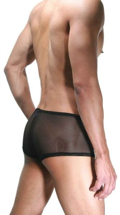 Мужские трусы-хипсы из гладкого материала, имеющие спереди гладкую вставку с молнией. По бокам и на ягодицах использована полупрозрачная ткань.