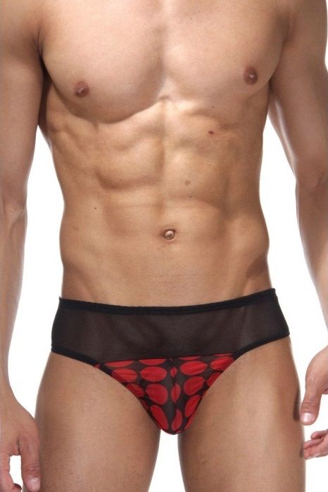 Мужские трусы-тонги с широкой полосой из мелкой сетки, скомбинированной с тканью в крупный красный горох.
