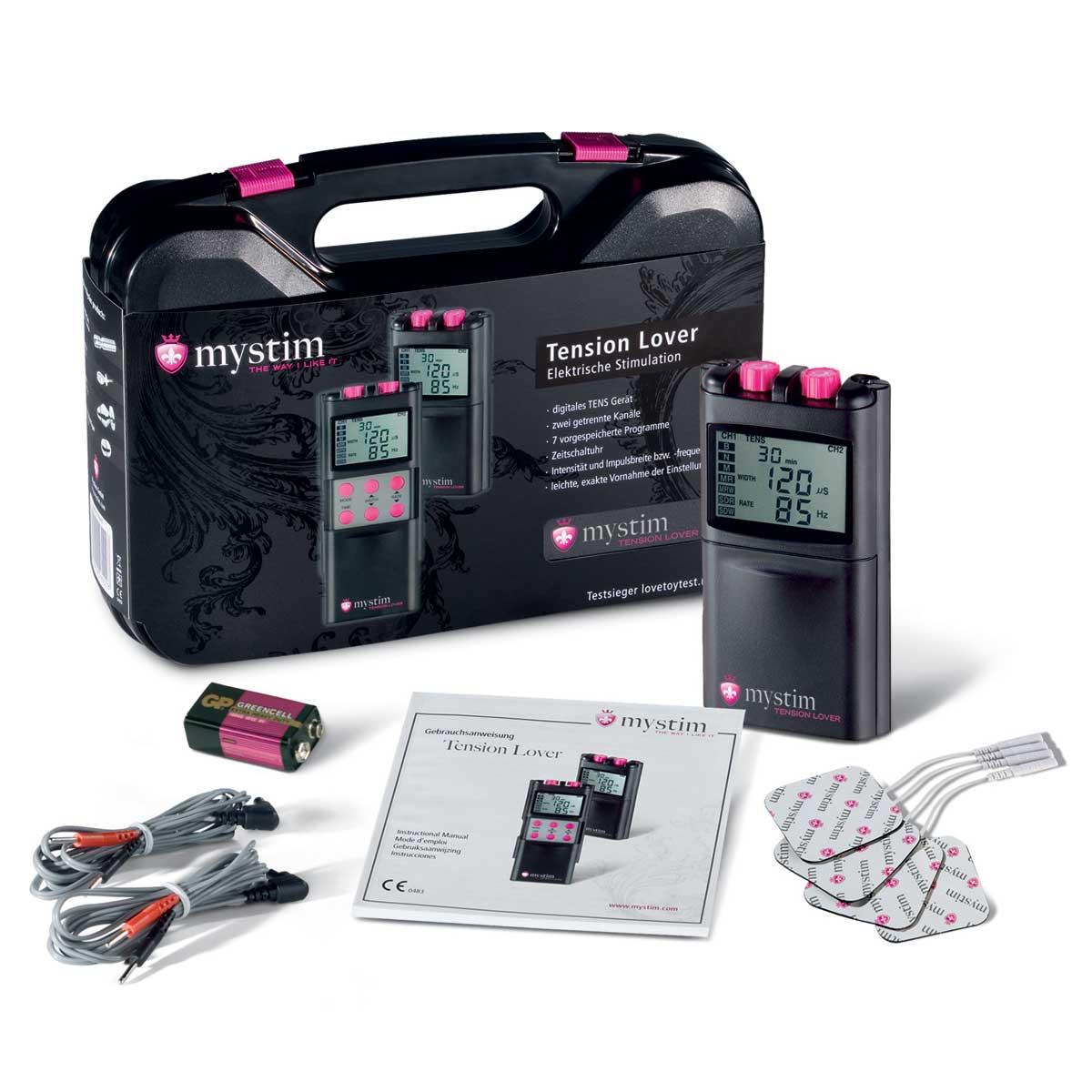 Mystim Tension Lover – прибор, предназначенный для стимуляции тела электрическими импульсами различной интенсивности. Воздействуя на эрогенные зоны электрическими сигналами, он заставляет мышцы сокращаться, а значит, вас – возбуждаться. Касание электронасадок дарят широкий спектр ощущений – от приятного покалывания до мучительной пульсации. Таким образом, в отличие от секс-игрушек, устройство способно дарить как наслаждение, так и боль. На ваш выбор представлены 7 различных программ для самоудовлетворения. Однако, если вам хочется поэкспериментировать, всегда можно изменить интенсивность, длительность импульса и частоту вручную. К 2 индивидуально настраиваемым каналам можно подключить 2 электронасадки – для вагинальной, анальной, уретральной стимуляции, массажа всего тела. В комплекте:MYSTIM TENS UNIT, 2 провода, 4 самоклеющихся электрода, пластиковый чемодан,1 батарея 9 Вольт и инструкция на русском языке