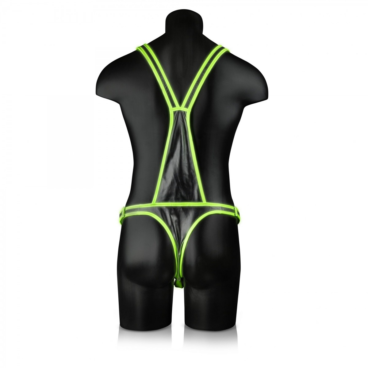 Экстравагантная мужская сбруя с трусами на заклепках для удобного доступа и комфортного ношения. Выполнена из высококачественной экокожи и оформлена люминесцентными полосками. В темноте будут светиться все самые интересные места.